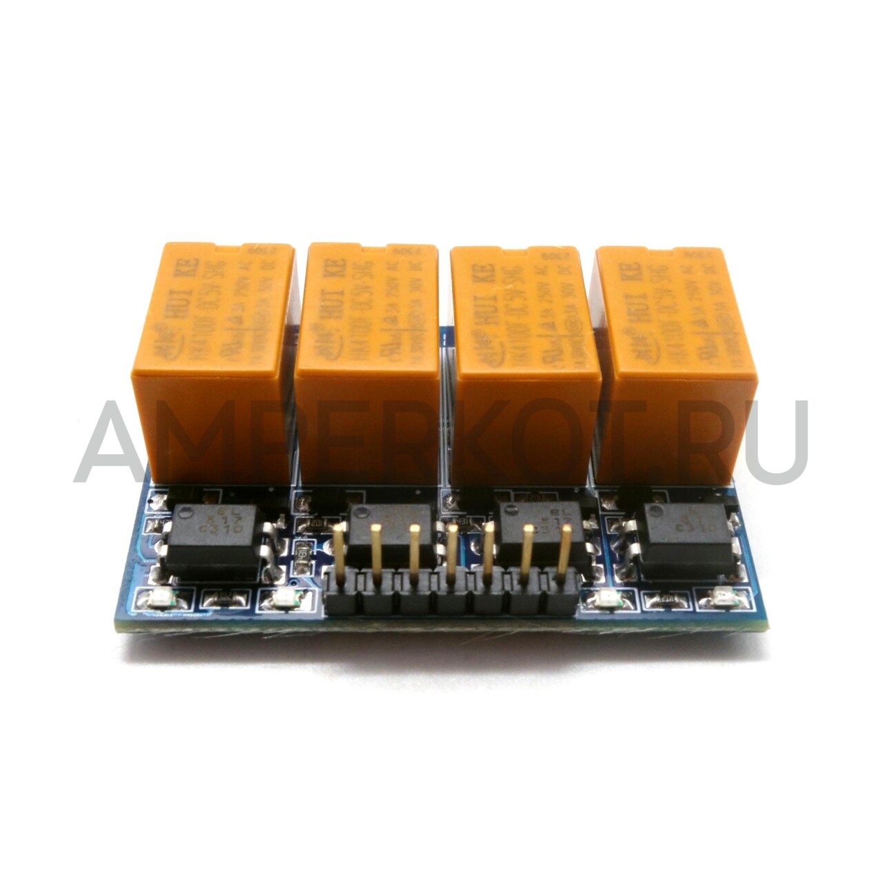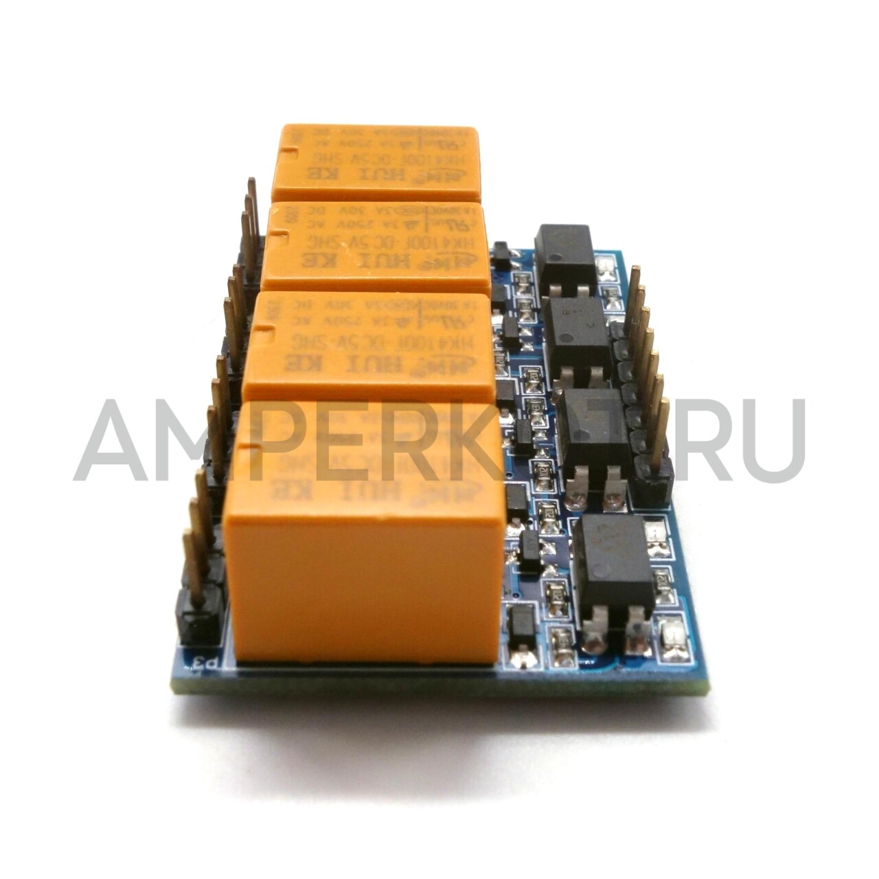 Модуль построен на базе электромагнитных 6-ти контактных реле HK4100F-DC5V-SHG позволяющих коммутировать напряжение переменного тока (до 3А) до 250V или напряжение постоянного тока (до 3 А) до 30V. Реле имеет нормально-разомкнутую и нормально-замкнутую пары контактов. Модуль включает 4 независимых канала с опторазвязкой и управление единицей. Рабочее напряжение модуля составляет 5V. Размер платы 47х33х15 мм