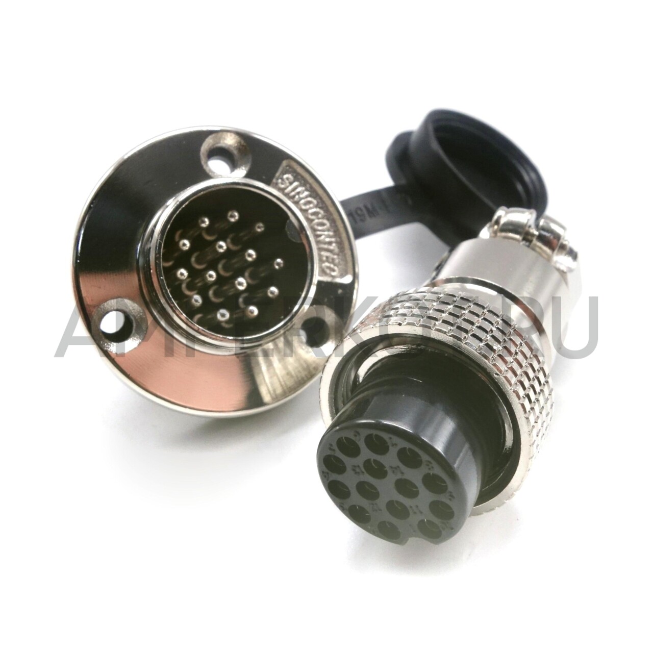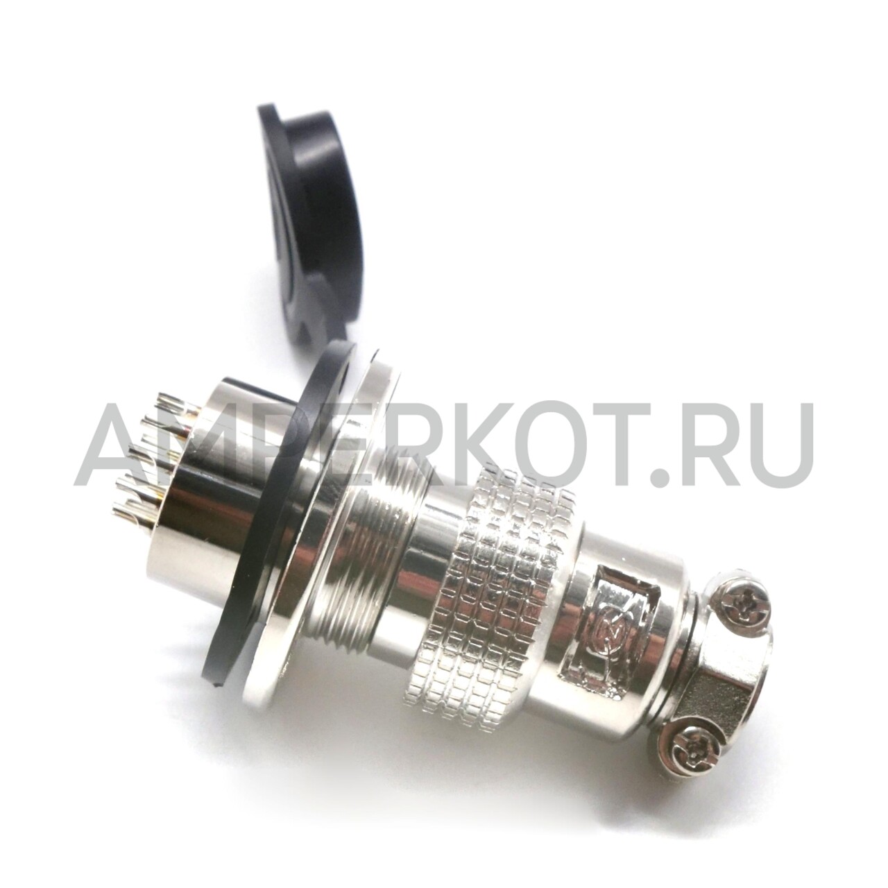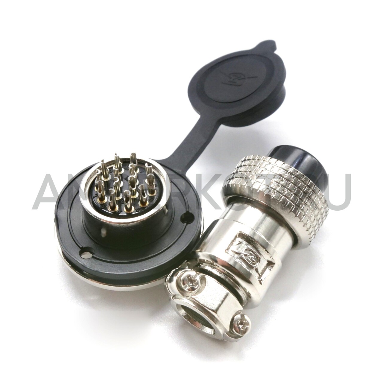 Комплект водонепроницаемого цилиндрического, кабельного разъема GX19 включает штекер, гнездо с фланцем для установки на панель, а также водо- пылезащитную крышку. Разъем имеет 14 контактов и позволяет коммутировать напряжение до 150V с максимальным током 5А. Корпус разъема изготовлен из цинковый сплав. Контакты медные, луженые, под пайку.