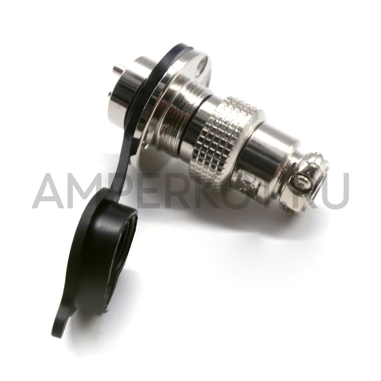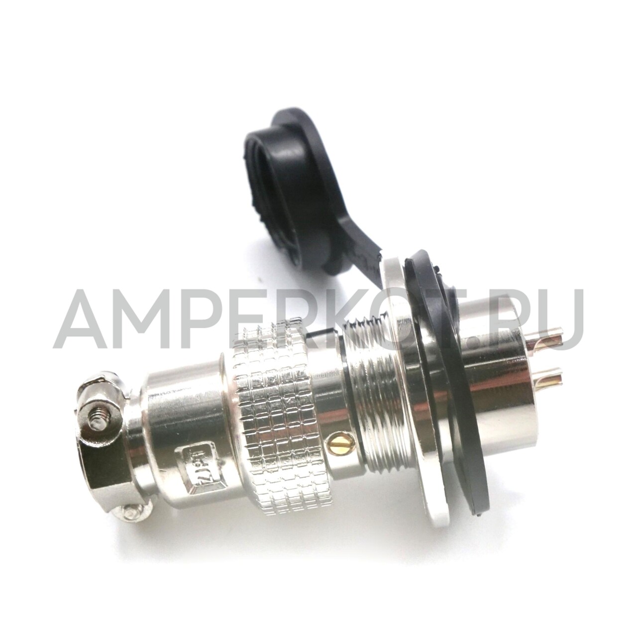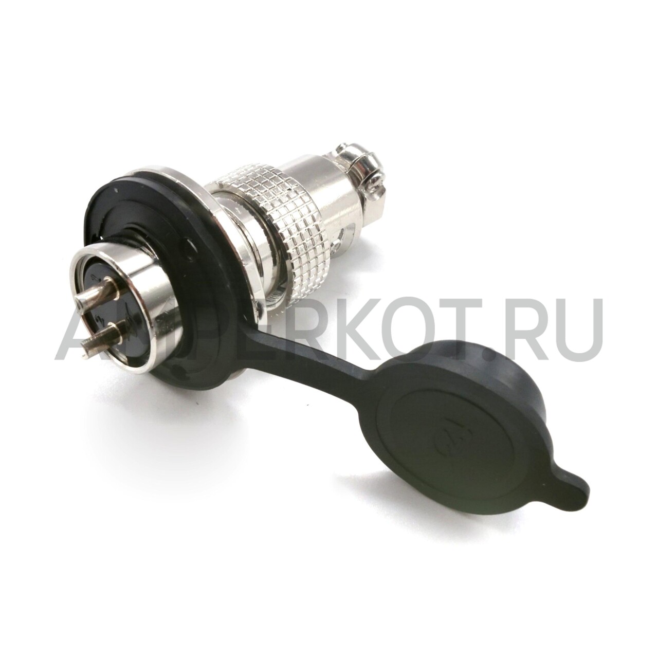 Комплект водонепроницаемого цилиндрического, кабельного разъема GX19 включает штекер, гнездо с фланцем для установки на панель, а также водо- пылезащитную крышку. Разъем имеет 2 контакта и позволяет коммутировать напряжение до 250V с максимальным током 10А. Корпус разъема изготовлен из цинковый сплав. Контакты медные, луженые, под пайку.