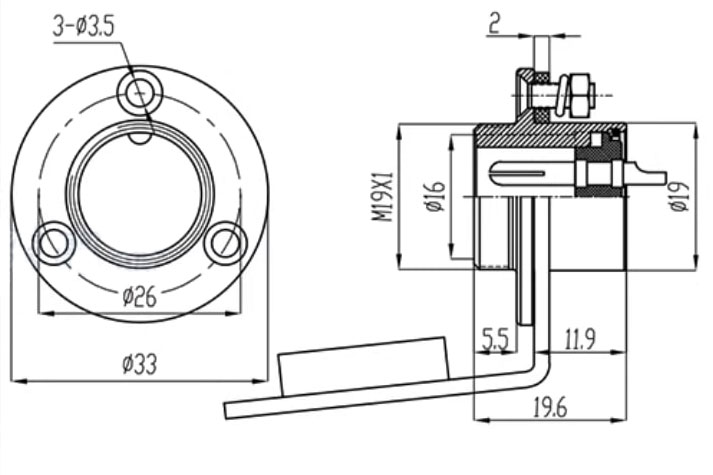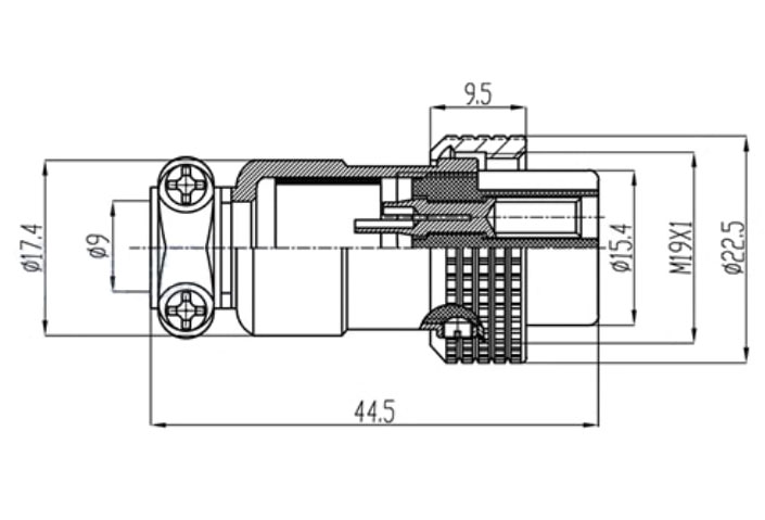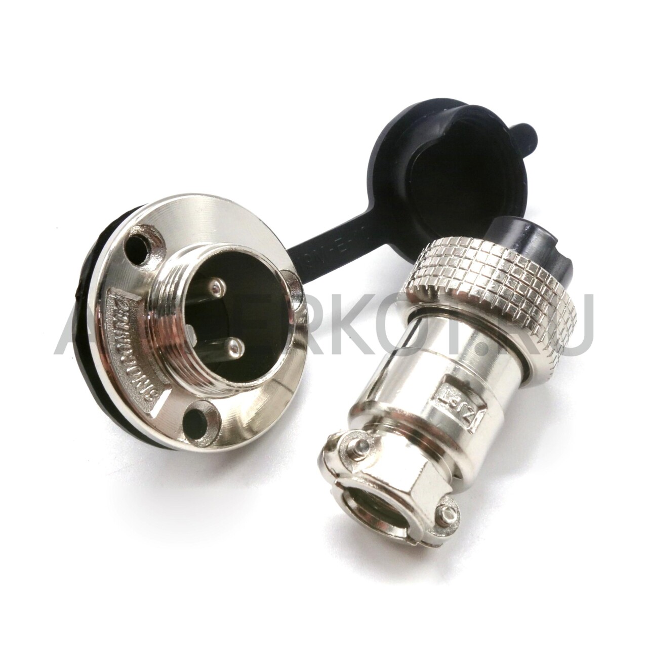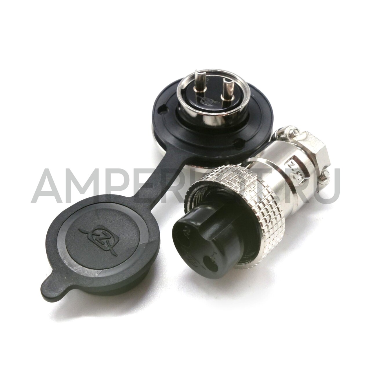 Комплект водонепроницаемого цилиндрического, кабельного разъема GX19 включает штекер, гнездо с фланцем для установки на панель, а также водо- пылезащитную крышку. Разъем имеет 2 контакта и позволяет коммутировать напряжение до 250V с максимальным током 10А. Корпус разъема изготовлен из цинковый сплав. Контакты медные, луженые, под пайку.