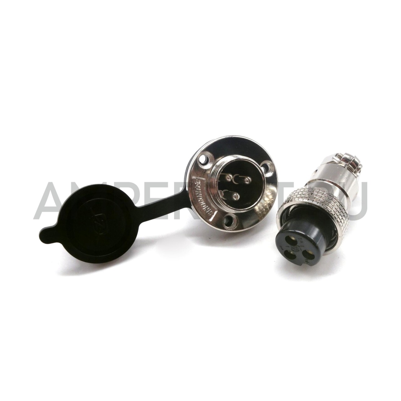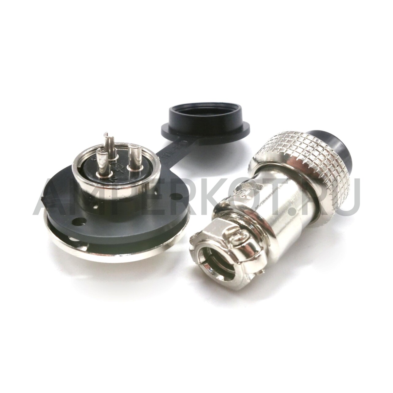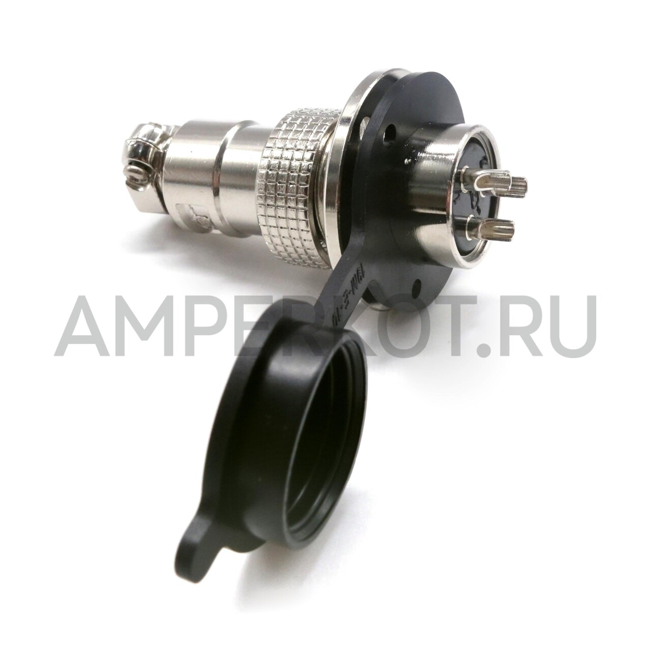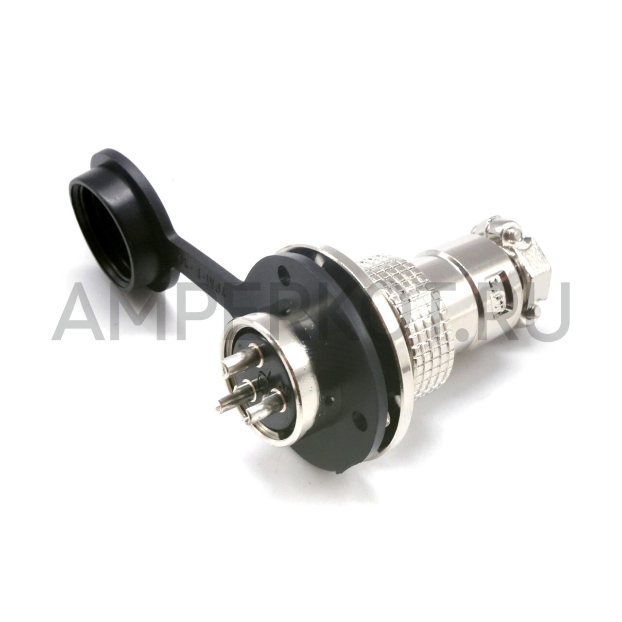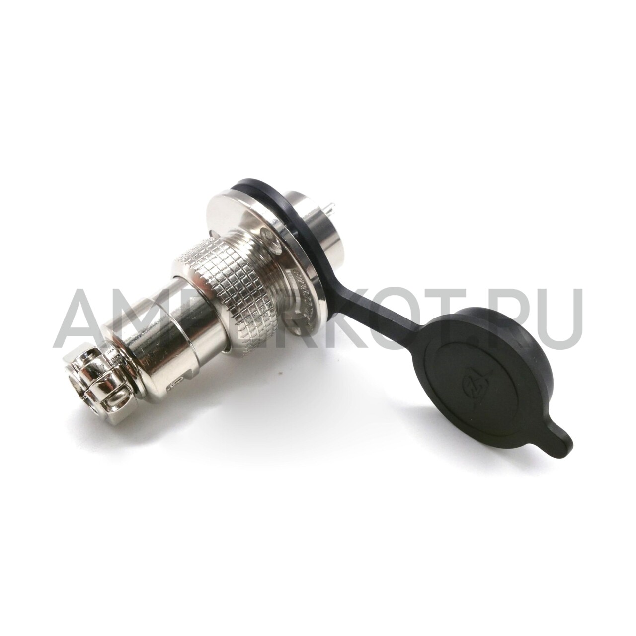 Комплект водонепроницаемого цилиндрического, кабельного разъема GX19 включает штекер, гнездо с фланцем для установки на панель, а также водо- пылезащитную крышку. Разъем имеет 3 контакта и позволяет коммутировать напряжение до 250V с максимальным током 7А. Корпус разъема изготовлен из цинковый сплав. Контакты медные, луженые, под пайку.