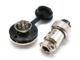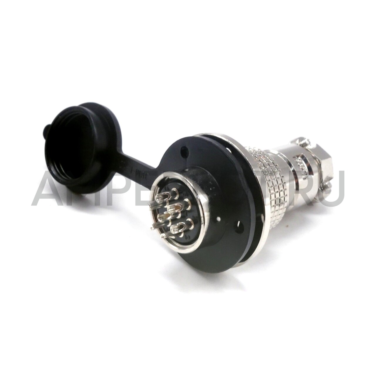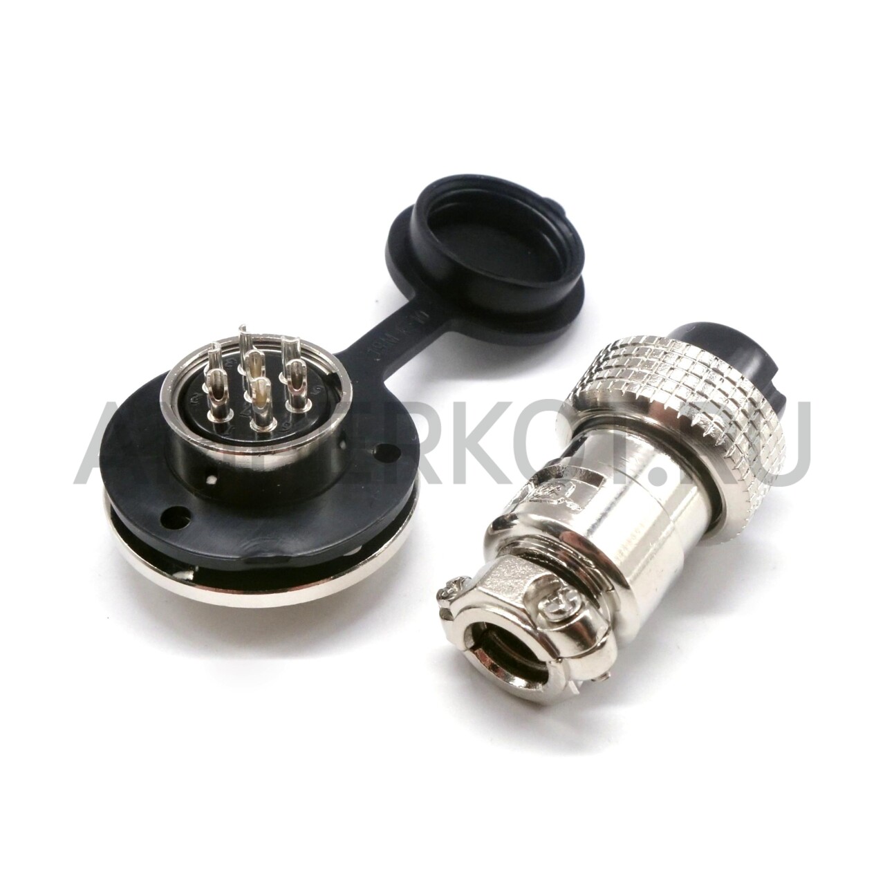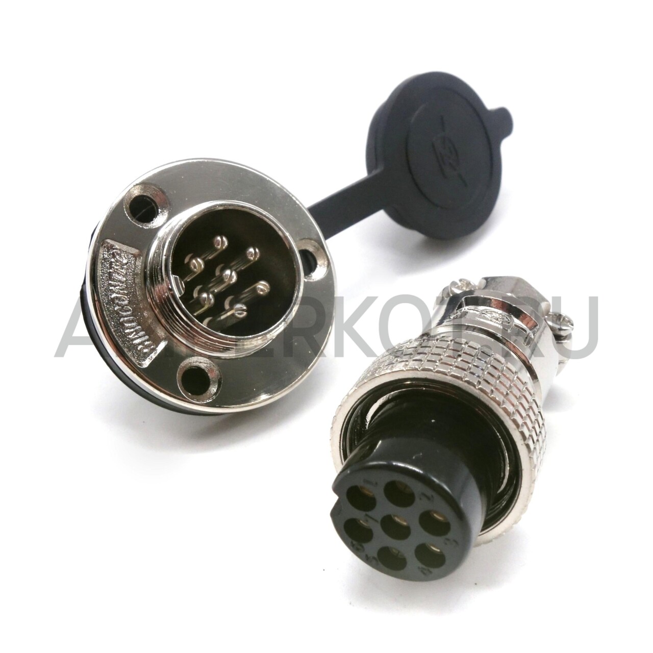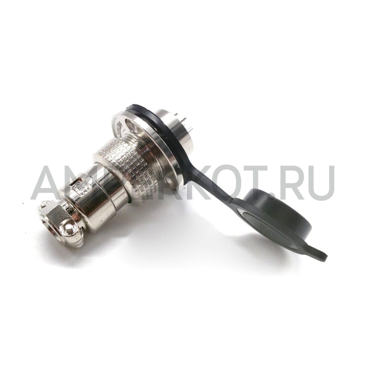 Комплект водонепроницаемого цилиндрического, кабельного разъема GX19 включает штекер, гнездо с фланцем для установки на панель, а также водо- пылезащитную крышку. Разъем имеет 7 контактов и позволяет коммутировать напряжение до 150V с максимальным током 5А. Корпус разъема изготовлен из цинковый сплав. Контакты медные, луженые, под пайку.