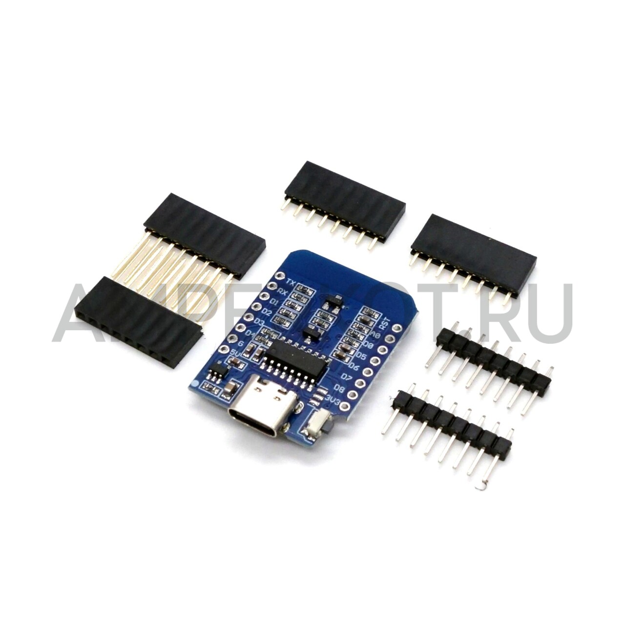 Миниатюрная отладочная плата WEMOS D1 MINI построена на базе микроконтроллера ESP-8266EX со встроенным WIFI. На плате имеется USB-UART преобразователь и регулятор напряжения, 11 GPIO выходов, 1 аналоговый вход (3.2V макс.) и кнопка Reset. К особенностям данной модификации платы относится порт Type-C, используемый для питания и прошивки микроконтроллера и периферии.